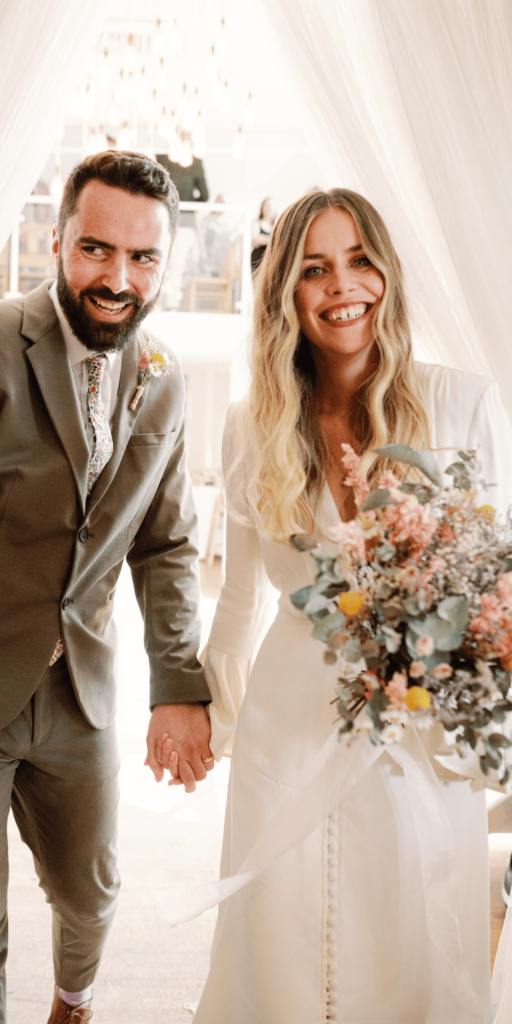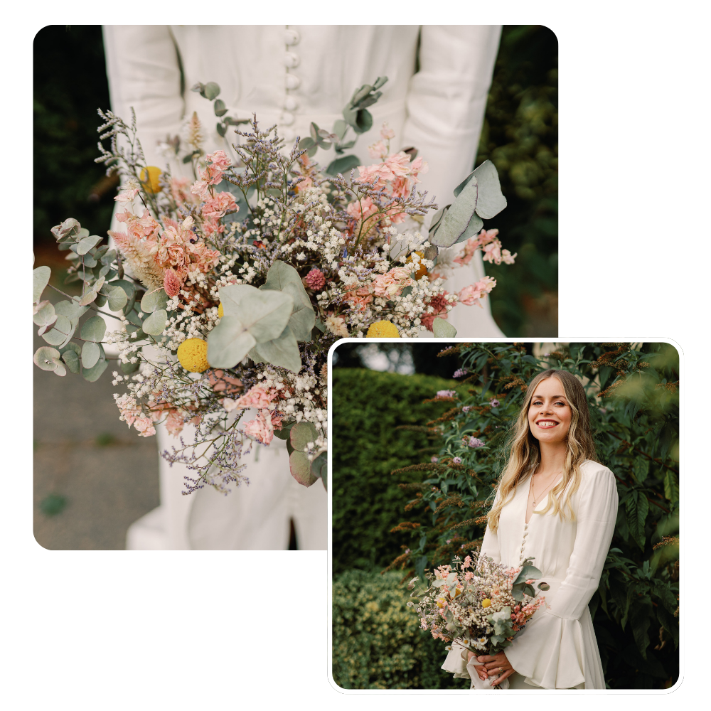 “When we started planning our wedding, we really wanted something different for our flowers. Finding Sophie was a game-changer. Her dried flower arrangements were just stunning – from the bouquets to the table settings, everything was so thoughtfully put together. Working with Sophie felt like chatting with a friend who just gets it. She made everything seem effortless. Our guests are still raving about how beautiful the flowers were. Sophie, you truly made our day extra special. A huge thank you from both of us.“